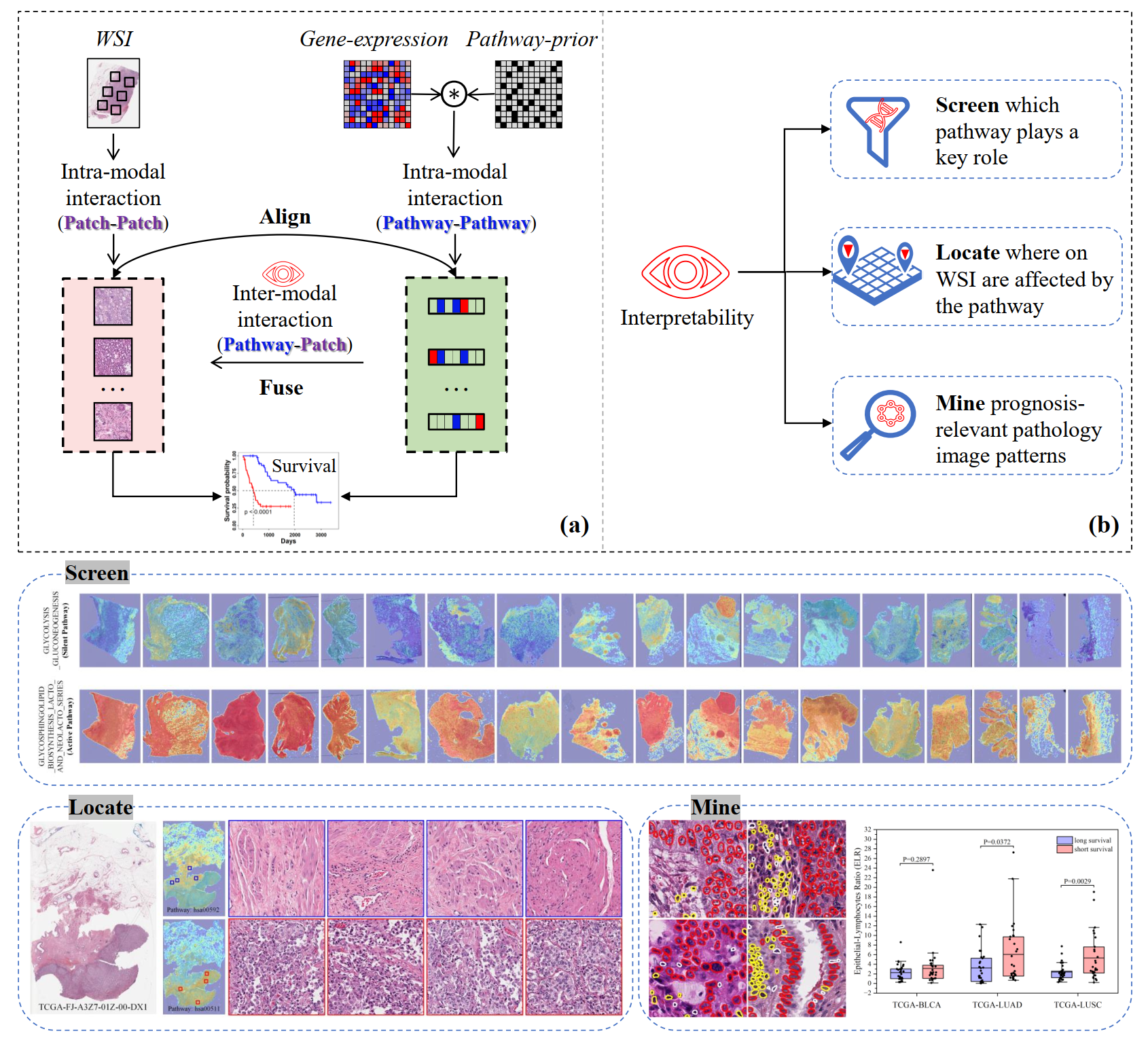 近日,中国科学技术大学生物医学工程学院周少华教授团队在人工智能领域国际顶级学术期刊IEEE Transactions on Pattern Analysis and Machine Intelligence(TPAMI)发表题为Pathway-aware multimodal transformer (PAMT): Integrating pathological image and gene expression for interpretable cancer survival analysis的研究论文。这一突破性进展缩小了病理图像与基因表达数据的 “语义鸿沟”,让癌症生存预测更精准且可解释;不仅能让更多癌症患者从精准治疗中获益,还可避免过度治疗,进而助力医疗资源最优配置,为精准肿瘤诊治铺平道路。该论文第一作者为中国科学技术大学生物医学工程学院特任副研究员颜锐,共同通讯作者为中国科学技术大学周少华教授、中国科学院计算技术研究所任菲博士;卞修武院士和团队其他成员及合作者也为本研究做出重要贡献。
