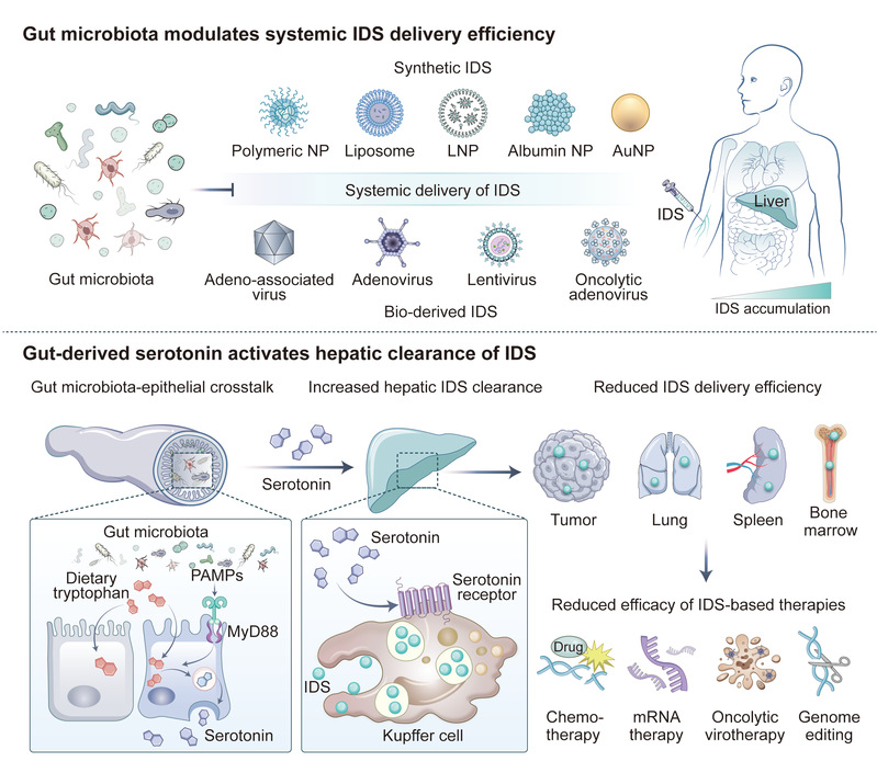 图1.肠道共生菌通过刺激肠道血清素分泌维持肝脏对递送载体的清除活性