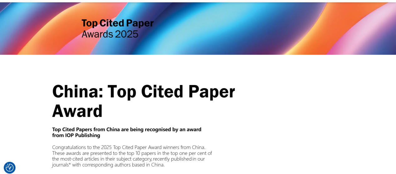 获奖名单已在IOP Publishing网站公布:https://ioppublishing.org/china-top-cited-paper-award/?utm_campaign=top-cited-2025&utm_medium=referral&utm_source=accredible