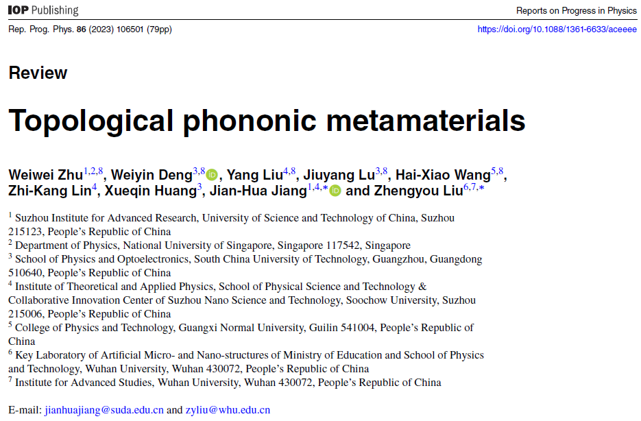 蒋建华教授团队在Reports on Progress in PhysicsIF=20.7)的综述论文“拓扑声子超材料”(Topological phononic metamaterials)入选IOP Publishing1%高被引论文。这篇综述是以中国科学技术大学苏州高等研究院为第一完成单位,联合武汉大学、华南理工大学、苏州大学及广西师范大学等多所高校的科研团队共同完成,通讯作者为我院蒋建华教授和武汉大学刘正猷教授。
